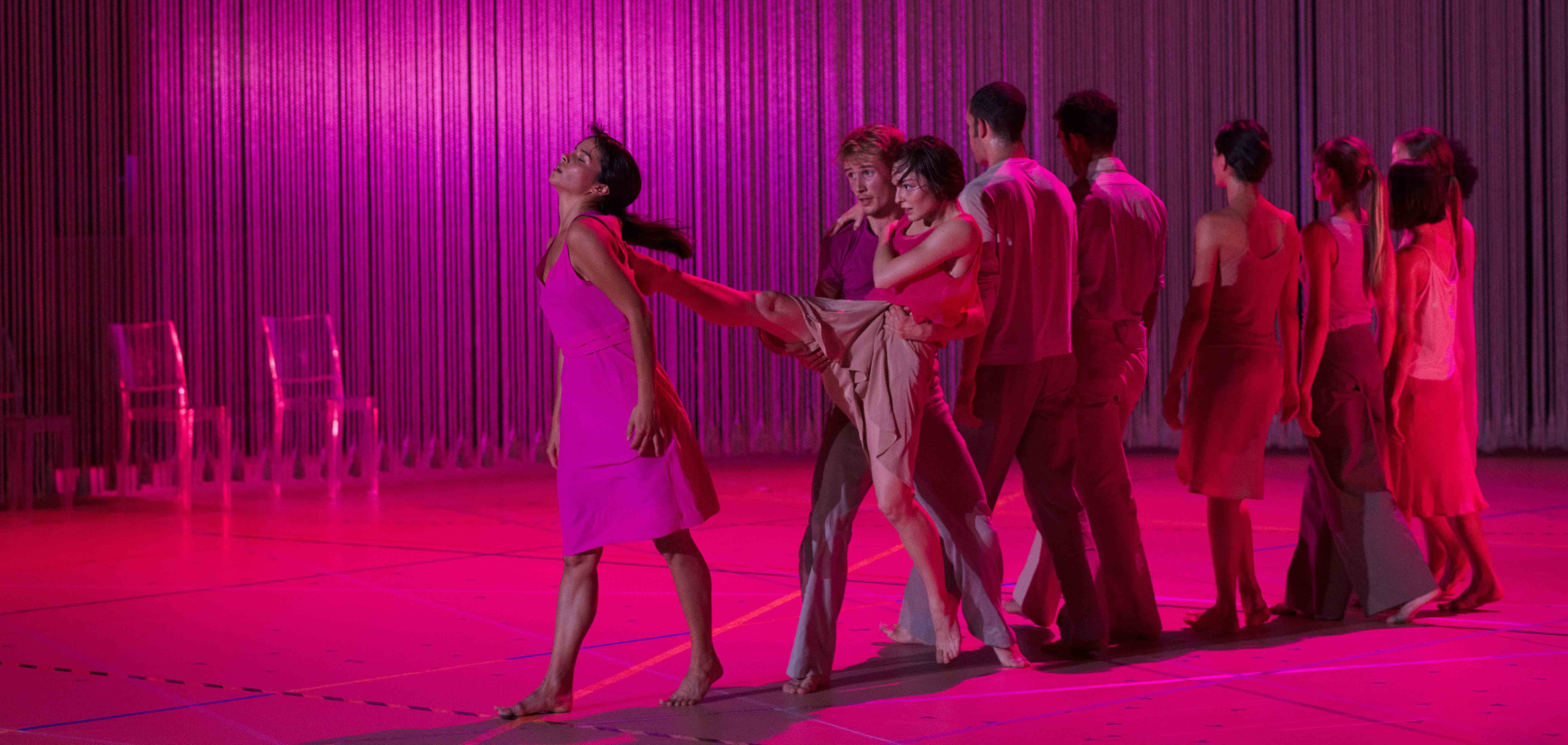 Durante una hora y diez minutos, diez bailarines corren, vuelan y chocan en el escenario, delineado por una cortina de finas cuerdas blancas, y despliegan una impresionante sucesión de piezas de baile. Las estructuras matemáticas, el uso implacablemente geométrico del espacio, el arte de la variación constante