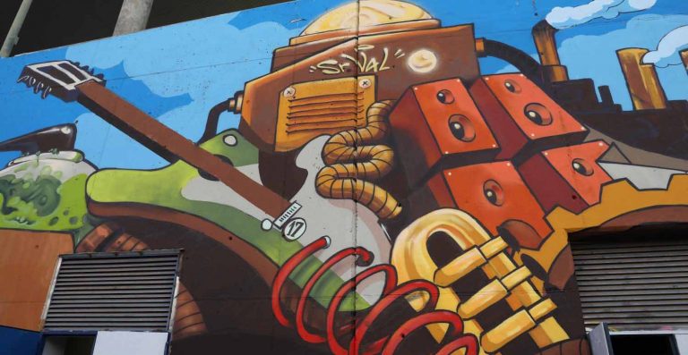 Un motor hecho a base de engranajes y de instrumentos musicales. Esta singular propuesta, con la que se ha querido representar la importancia de la cultura como motor de los barrios, es el tema del mural que embellece el muro exterior de los locales de ensayo de la biblioteca pública municipal Miguel Delibes, en el distrito de Moratalaz. La actuación tiene un valor añadido: su creación es fruto de la colaboración entre los vecinos y vecinas del distrito y el artista urbano Sr. Val. Se trata de la propuesta de arte urbano participativo a la que invita el programa ‘Compartiendo muros’, que el Área de Cultura y Deportes del Ayuntamiento está desarrollando junto con el grupo municipal del Partido Socialista en seis distritos de la ciudad.