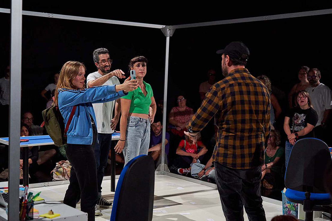 La obra tiene un latido universal. La adrenalina de la función hace que, a veces, no seas tan consciente de la velocidad que estás llevando hablando en términos técnicos. En términos reales, la obra tiene un ritmo, que no es tranquilo porque simula la vorágine de nuestras vidas. El tiempo para mí cada vez pasa más rápido. He perdido la dimensión del tiempo o ésta se altera mucho. Estamos atrapados en la vorágine de la productividad y la obra tiene algo de eso, de estar metido dentro de un lugar, repitiendo las acciones en una oficina, de la oficina a la mesa de ping pong, de la mesa de ping pong al ordenador, del ordenador al teléfono…