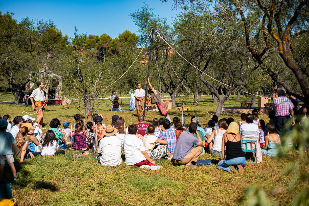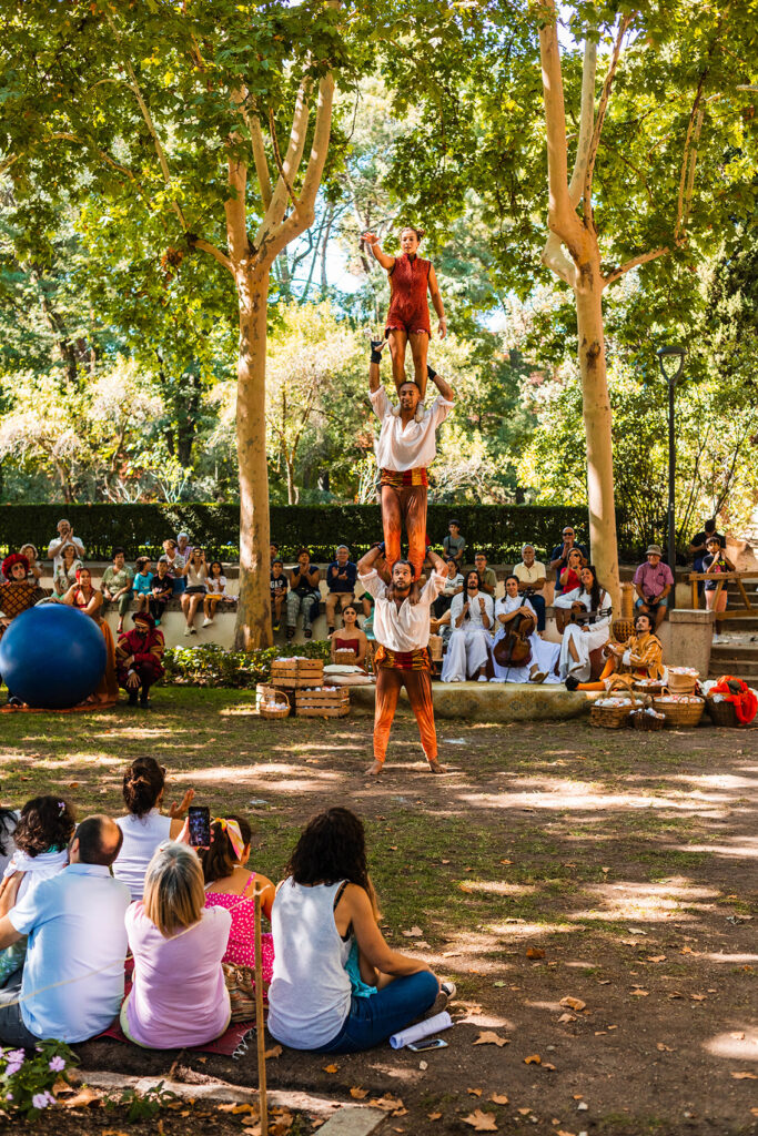 En septiembre la idea era hacer una fiesta popular, algo festivo y circense para toda la familia. Que tuviese humor y fuese participativo. Se nos ocurrió que el propietario de la Quinta podría ser un marqués enamoradizo que había organizado una gran fiesta en su palacio para festejar la cosecha. En la gran zona de los almendros representábamos la cosecha de las almendras. El fruto de los almendros se desperezaba simbólicamente con una pareja de verticalistas que realizaban un número sobre lo que llamamos pulls; cuatro zancudos vareaban coreográficamente los almendros y para llegar a lo más alto un aldeano se subía a un mástil realizando un número cómico. Una joven moza se paseaba entre los almendros subida a un cable de equilibrio mientras los demás miraban embobados. Todo ello aderezado por la música en directo de un trío formado por violinista, violonchelista y guitarra; y una escenografía de cestos de mimbre y utensilios de labranza.