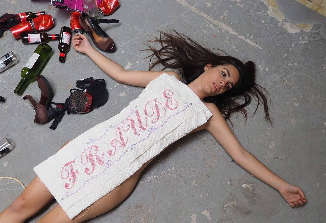 Esta obra parte de la aceptación del fracaso, del error, de reconocerme como un fraude. Primero aparecieron los bordados. La primera poetización de los monstruos. En bellísimo punto de cruz en rosa y lila pastel las palabras que más me he repetido: Fraude, Vaga, ahora sirven de almohada sobre la que la protagonista reposa. Sobre una sábana blanca, bordado en rojo sangre se repite una y otra vez, una y otra vez la palabra ‘obsesivaobsesivaobsesivaobsesiva’.