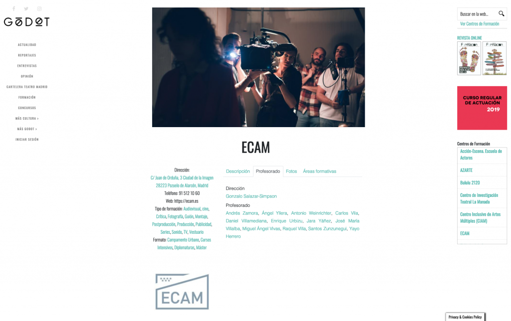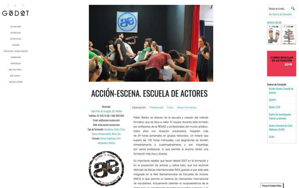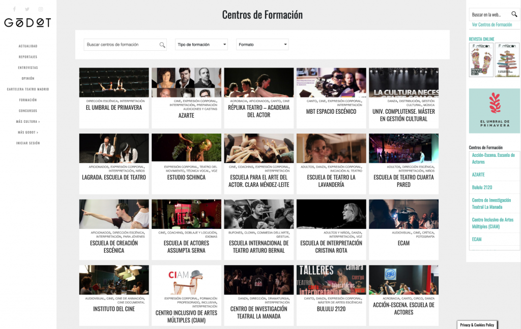 Tras 8 años publicando anualmente nuestro especial de Formación Artística en el mes de junio, desde Godot lanzamos un espacio web dedicado en exclusiva a mostrar toda la información relacionada con este sector. De esta forma queremos facilitar la relación entre los usuarios que buscan la mejor opción para su futuro y las empresas y centros de formación que quieren promocionar y mostrar toda su oferta formativa de una forma clara y atractiva.