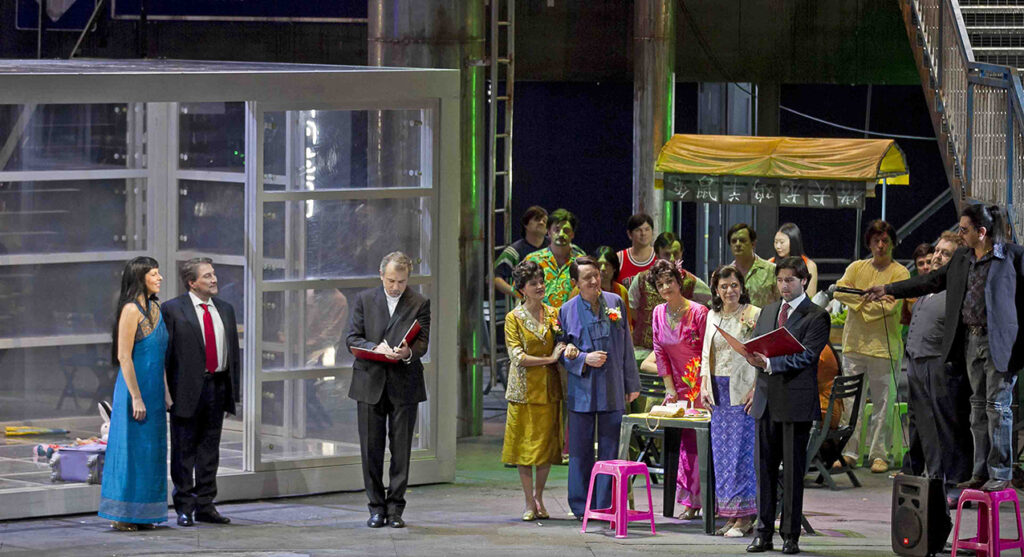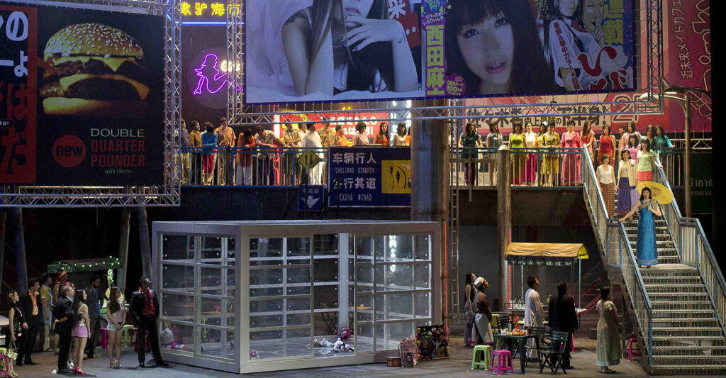 En la producción concebida para el Teatro Regio de Torino, Michieletto despoja la ópera del esteticismo orientalista y sitúa la trama en la actualidad, en los suburbios de una bulliciosa ciudad asiática con carteles publicitarios y letreros de neón concebida por el escenógrafo Paolo Fantin, donde habita Cio-Cio-San, refugiada con sus sueños juveniles en una habitación de plexiglás.