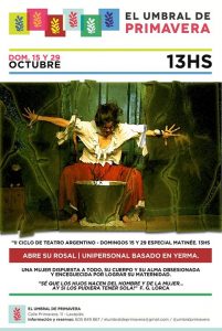 Abre su rosal es un monólogo basado en Yerma de Federico García Lorca. Es el resultado de un trabajo de investigación que buscaba una puesta intimista para abordar los fantasmas lorquianos. Es un pedido, un ruego, una súplica. Ser madre es el único deseo que tiene esta mujer. Todo su cuerpo, su alma obsesionada y enceguecida por lograr su maternidad. Es una mujer dispuesta a todo… Menos a romper los mandatos impuestos por la religión y la sociedad.