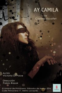 ¡Ay! Camila, de Cristina Escofet es un manifiesto de la lucha de las mujeres por “ser quienes quieren ser”. Camila O’ Gorman ejemplo histórico de una mujer que enfrentó a los Poderes de turno. Una niña de la alta sociedad argentina que por amor ofreció todo lo que tenía. Nos encontramos en los albores de la nueva República Argentina, por los años 1840, Camila O’ Gorman de 20 años se escapa al norte argentino con Uladislao, el cura de Santos Lugares, para empezar una nueva vida.