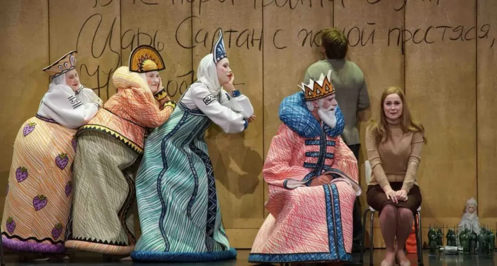 Se trata de una coproducción del Teatro Real, estrenada en La Monnaie y ganadora del Premio Internacional de Ópera al Mejor Montaje en 2020. Su argumento presenta tres hermanas. La más joven es elegida por el zar Saltán para ser su esposa, mientras que a las otras dos las contrata como su cocinera real y su tejedora real. Estas se ponen celosas de su hermana menor y cuando el zar se va a la guerra, la zarina da a luz a un hijo: el príncipe Gvidón. Es entonces cuando las hermanas mayores hacen lo necesario para que la zarina y el niño sean desterrados y ambos terminan en una remota isla, Buyán.