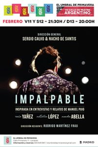 Impalpable está inspirada en textos, entrevistas y la biografía del escritor argentino Manuel Puig (El beso de la mujer araña y Boquitas Pintadas, entre otras grandes obras). En un pueblo en el cual el silencio y la mentira funcionan como premisas, las protagonistas de Impalpable se ven obligadas a tapar la realidad con la ficción. Tal como los personajes de la literatura de Puig, ellas se refugian en la época dorada del cine de los años cincuenta y en las biografías de sus actrices predilectas, para huir de un paisaje atravesado por la distancia, las calles de tierra y las interminables siestas que se suceden cada tarde como un círculo vicioso. En relación directa con el relato, la puesta en escena de Impalpable se organiza a partir de recursos propios del cine.