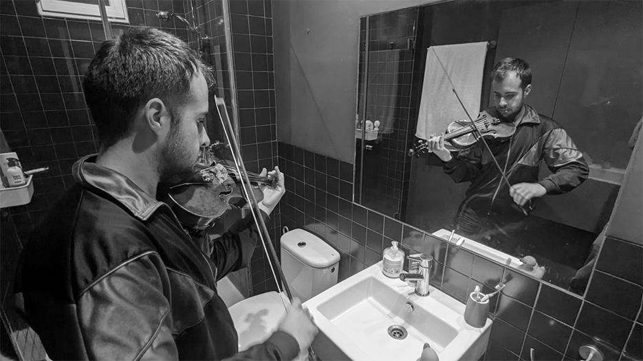 Tras la entrevista, Marina (otra actriz), llega a su casa y estudia el episodio de mañana. Mario (otro actor / músico) afina su violín.