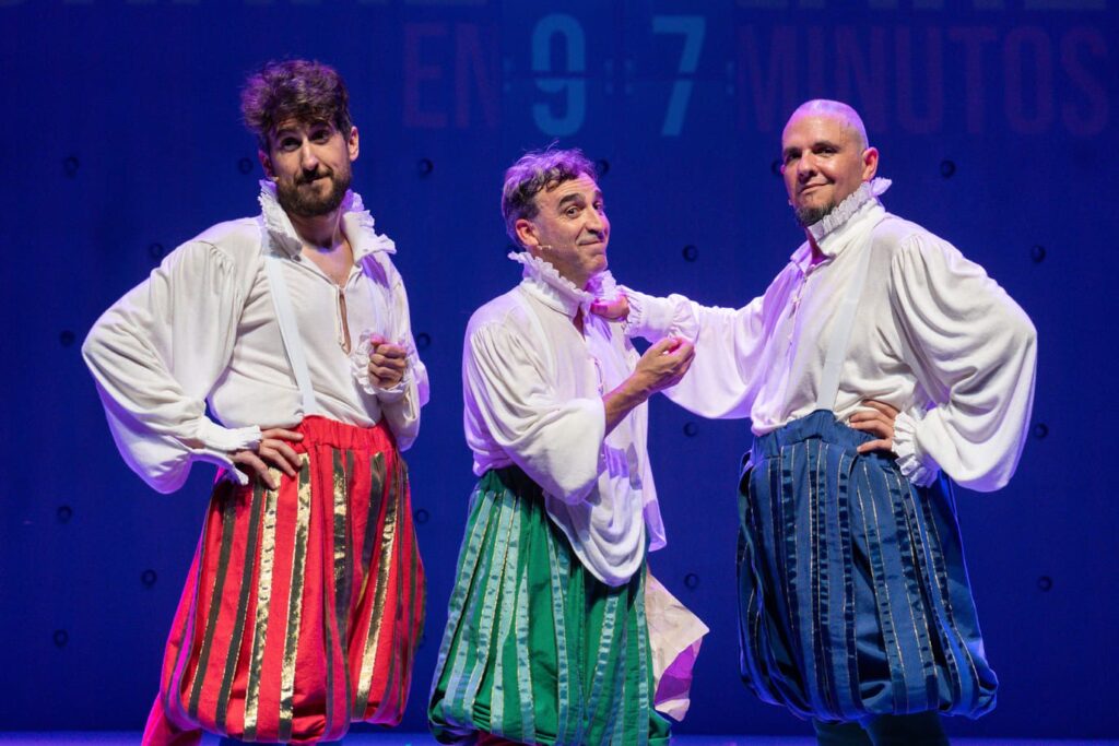 Shakespeare en 97 minutos es un espectáculo teatral de humor delirante que nos invita a zambullirnos en el mundo del mítico dramaturgo a través de la risa. Tres actores se proponen interpretar desde la parodia todas las obras de William Shakespeare en solo 97 minutos ¿serán capaces de lograrlo?