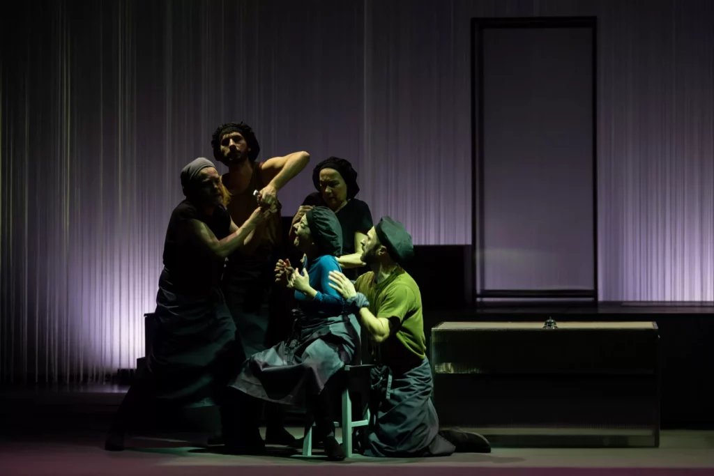 Eso fue algo que al autor le gustó mucho. Como directora, me parecía fundamental cómo abordar la violencia, porque en la obra está muy condensada. Al principio teníamos tres secuencias y finalmente las fundimos en una sola, muy estilizada. La cigarra que se convierte en prostituta está interpretada por un actor, precisamente para subrayar este cambio de percepción: la violencia de género se da en un 98% de hombres hacia mujeres, y es un tema que nos conmueve, que nos pone la piel de gallina y que resulta muy difícil de representar. Está resuelto sobre todo a través de imágenes, con signos muy claros. Todo ello, insisto, de forma muy estilizada, pero sin restarle el carácter trágico. En la obra, la hormiga transformada en tendero pone a la venta a esta mujer, y distintos vecinos van pasando y la maltratan, la violan, la someten. Es una escena breve, estilizada, pero de gran impacto. Creo que era una de las partes más difíciles de resolver, y la hemos resuelto bien, en el sentido de que significa, de que no pasa de puntillas.