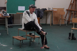 Justamente al tratarse de un unipersonal con muchísimo riesgo y que demanda un verdadero desafío, tuve la fortuna de poder hacerlo como una verdadera pieza colectiva, en cada fragmento está el trabajo en colaboración, de sugerencias, de aportes y a veces por supuesto, de marcación. De hecho para nombrarte algunos aportes indispensables como Pablo Razuk, con quien tengo un profundo diálogo actoral y una riquísima hermandad afectiva, te dirige como actor, usando e interviniendo con su cuerpo, se mueve a la par tuya, te imita, te sorprende, juega. Y también, el riquísimo aporte de las mujeres rosarinas para encontrar una feminidad no estereotipada, ni ridícula, para lo que conté con la ayuda Liliana Gioia, o de nuestra asistente de dirección, Graciela Sietecase.