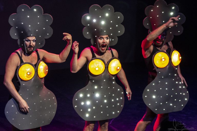 El espectáculo es un viaje delirante que parodia la sociedad que nos rodea “y como la sociedad en que vivimos es absolutamente esquizofrénica, ¡pues así es el espectáculo!”. Vistosas pelucas, olor a laca, máscara, tacones y muchas ganas de liarla parda: este es el sello de The Chanclettes, que se exhiben en un género que está entre el cabaret, donde, a diferencia de lo que sucede en el teatro, los espectadores pueden salir a tomar bebida y volver a entrar, aplaudir con frecuencia, levantarse y bailar; y el carnaval, una celebración de la vida con la subversión del orden establecido y de los papeles. No es casualidad que el lema de estos tres personajes excéntricos y travestidos sea: “La vida no es como es. La vida es como uno decide vivirla”. Josep Maria Portavella, Josep Coll y Xavier Palomino deciden vivir la vida con humor. La risa es el leitmotiv del espectáculo.