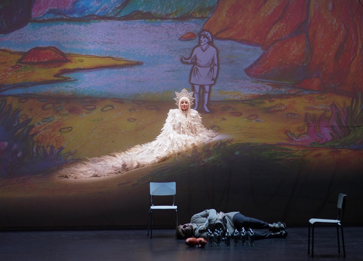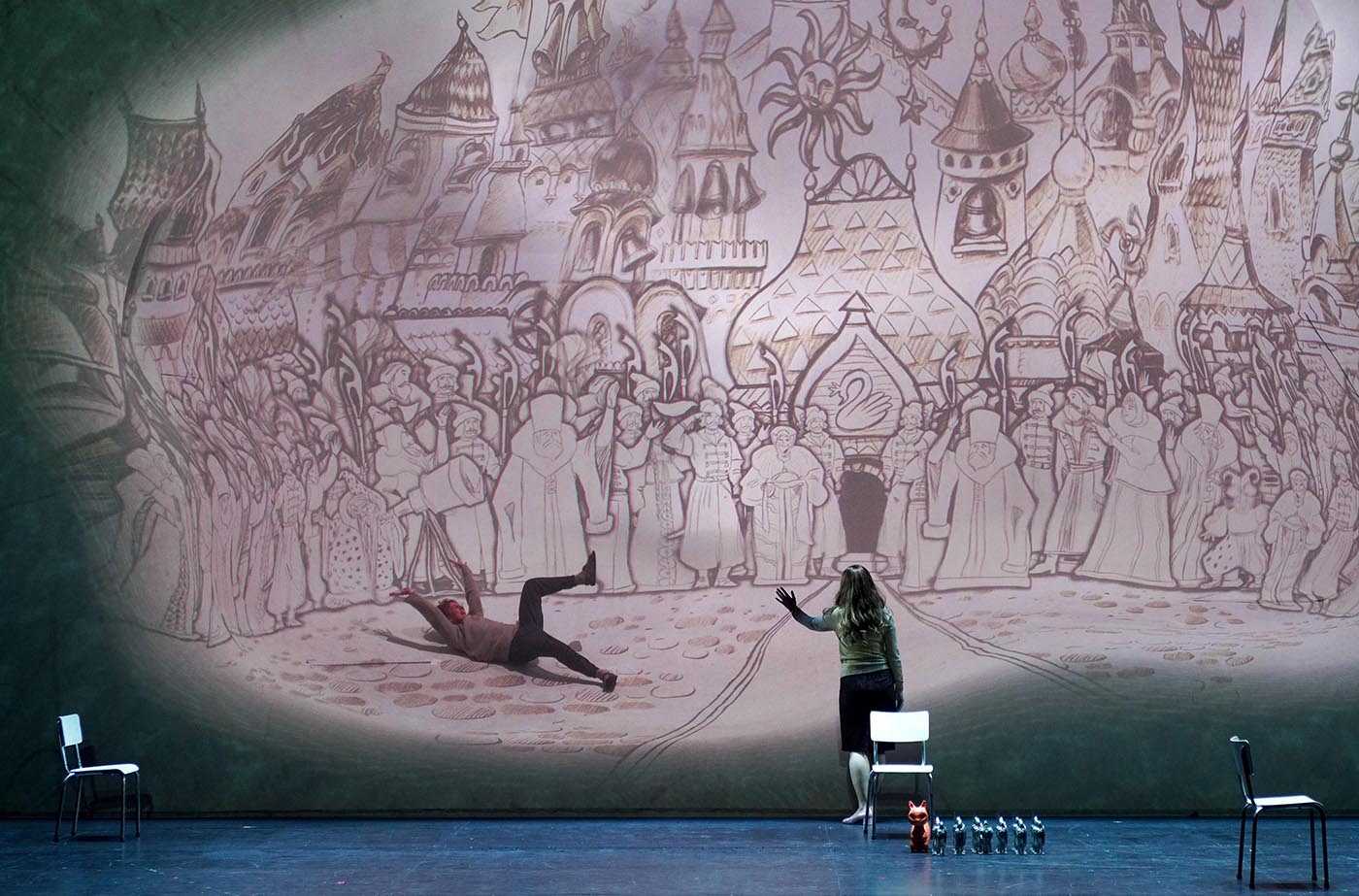 Este enredo infantil, que en la ópera se desarrolla con una música riquísima en efectos expresivos de múltiples colores y perfumes eslavos, el director de escena, Dmitri Tcherniakov, crea dos historias que se entremezclan, ampliando la fuerza aleccionadora del cuento con una lectura desasosegante, que sobrecoge al espectador, como si unos padres reflexionaran sobre un cuento fantástico que acaban de leer a su hijo.
