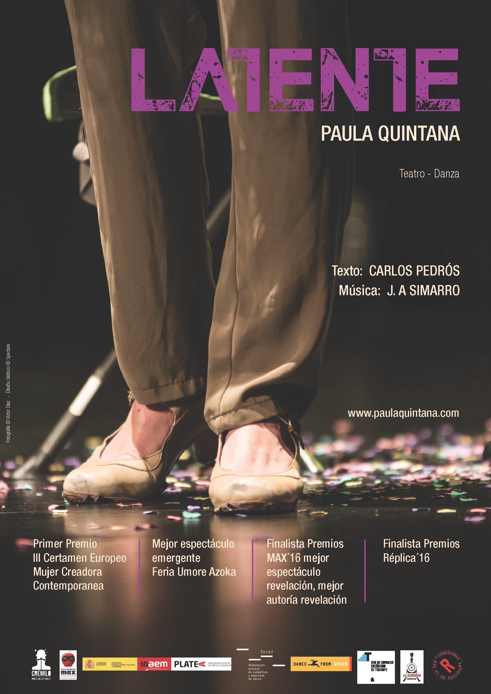 Paula Quintana es actriz, bailarina, creadora. Alterna el trabajo en compañías de teatro y danza con su carrera como creadora basada en un lenguaje propio que fusiona el lenguaje textual con la danza. Sus espectáculos y creaciones ‘site specific’ han viajado dentro y fuera de España: Miami, Nueva York, Londres, El Congo, Montevideo, etc. Primer premio III certamen Europeo Mujer Creadora Contemporánea 2016; Premio Especial a la Mejor Artista/Creadora Emergente «por la madurez mostrada para integrar danza y teatro» en la Feria Umore Azoka (Vizcaya) y candidata al Premio Max 2016 en dos categorías por Latente: «mejor espectáculo revelación» y «mejor autoría revelación».