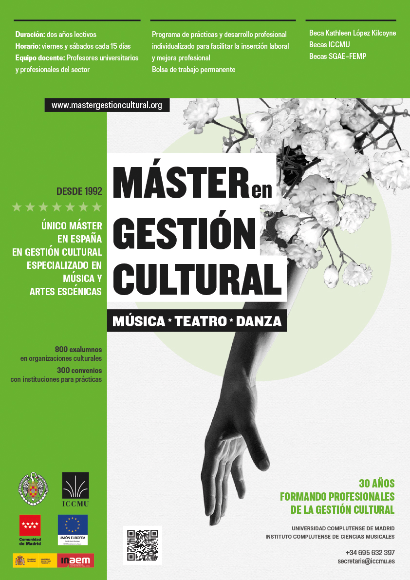 El Máster en Gestión Cultural: Música, Teatro y Danza de la Universidad Complutense de Madrid mantiene abierto el plazo de inscripción para el curso 2025_27 (consultar en su web plazos). Único título en España especializado en música y artes escénicas, su programa académico incluye un plan de prácticas personalizado de 400 horas formativas, a elegir entre más de 300 organizaciones de España y el extranjero. Hoy, 8 de cada 10 de sus ex alumnos son profesionales de la gestión cultural. El Máster ofrece 10 becas que van del 50% al 100% de la matrícula.