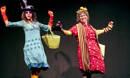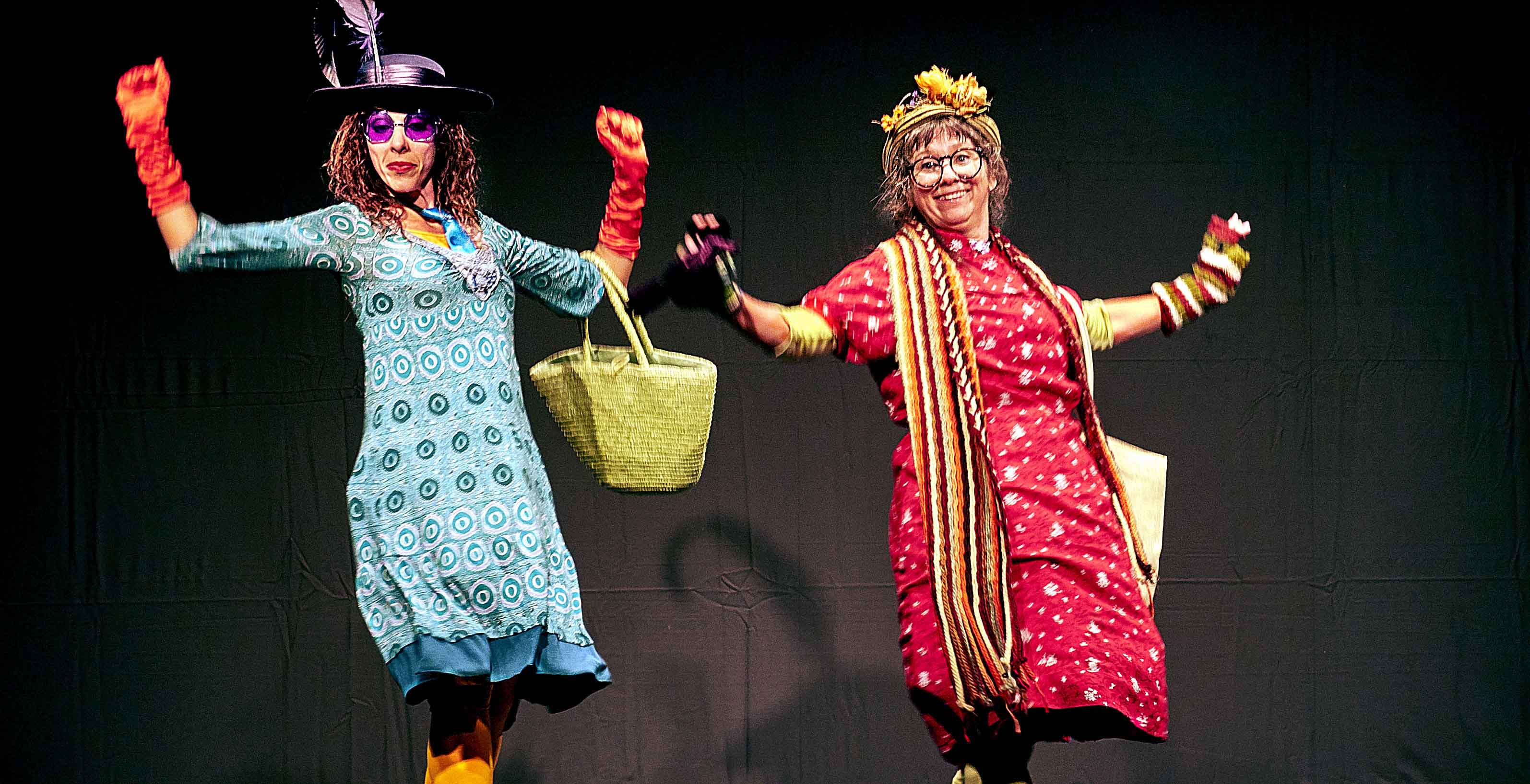 La proyección y música de Un globo, dos globos, tres globos dan inicio a la obra en la que Las Chamanas Katia y Selma cantan con el público el ‘cientotresaños’ feliz a Gloria Fuertes.