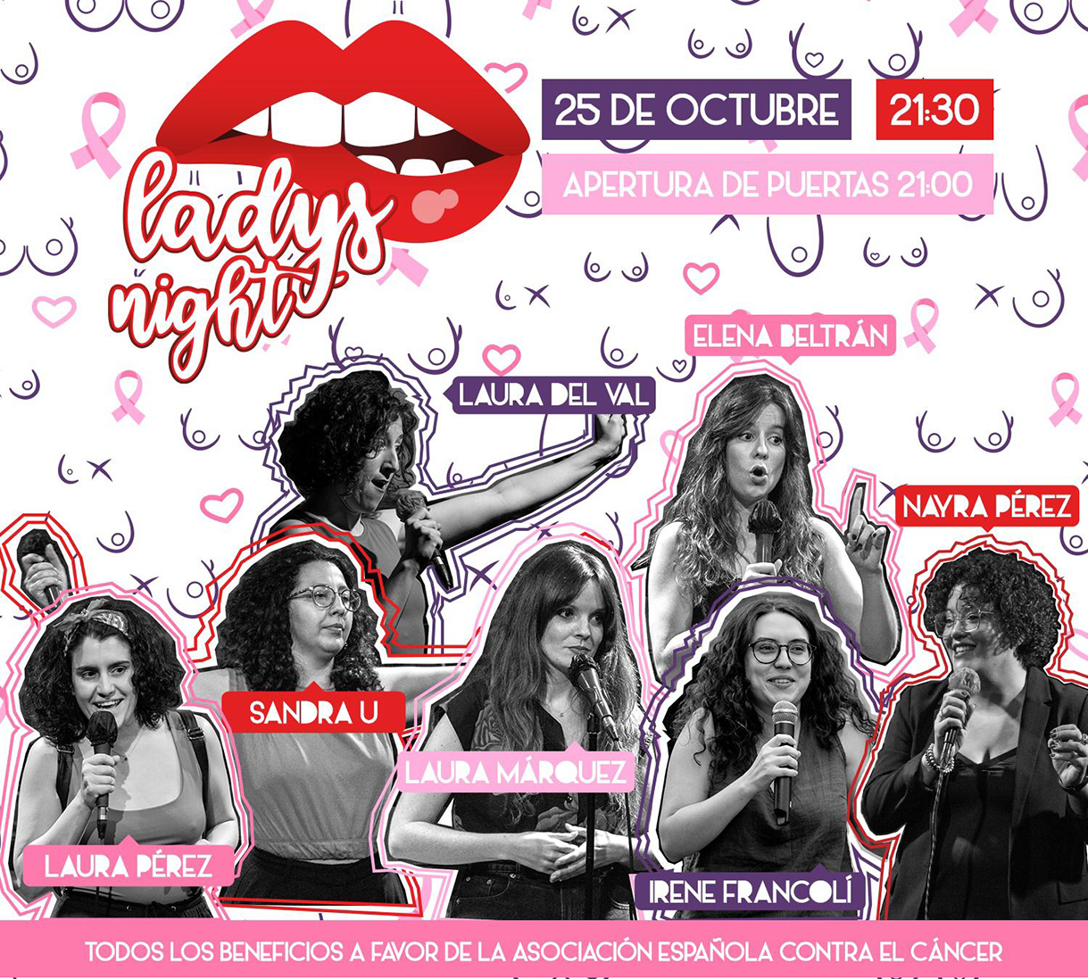 Esta gala benéfica se realiza en el marco de las actividades organizadas en octubre, mes de sensibilización contra el cáncer de mama. El total de los beneficios obtenidos irá destinado a la AECC. La finalidad es apoyar la investigación, detección y tratamiento del cáncer, con especial atención al cáncer de mama. Las siete cómicas que harán reír y disfrutar al público asistente durante la gala son: